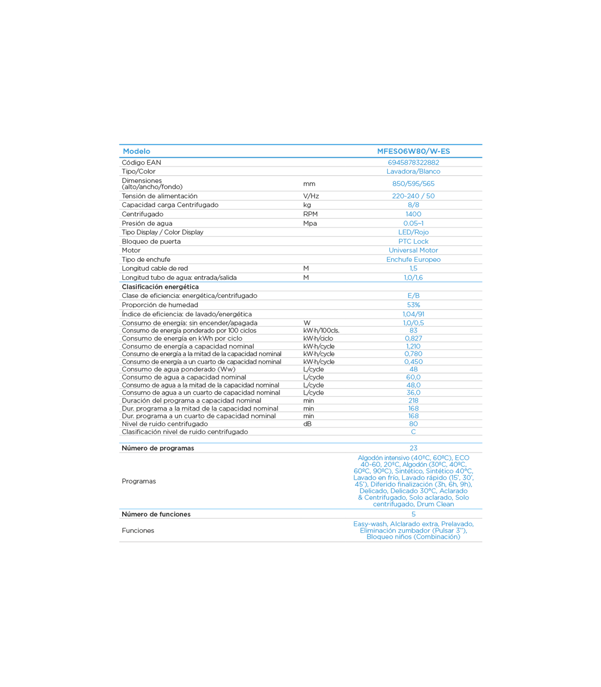 Lavadora de 8kg, 15 programas y 1400 rpm. Color blanco. Etiqueta energética D. Consumo de agua 52 litros/ ciclo. Consumo de energía 48 kWh/100 ciclos. Nivel de ruido: 73dB. Tipo de motor: AC. Dimensiones: 85 (Altura)...