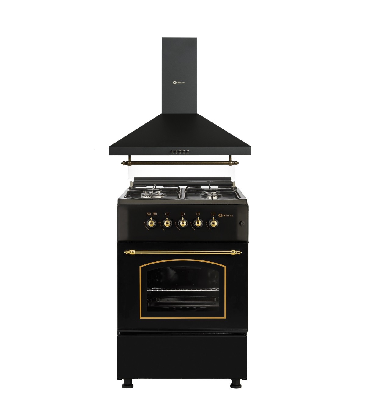 PACK SOLTHERMIC (NOIR RUSTIQUE ET GARNITURES DORÉES) CUISINIÈRE F6S40G2 NOIRE FOUR À GAZ + HOTTE 60 CM
