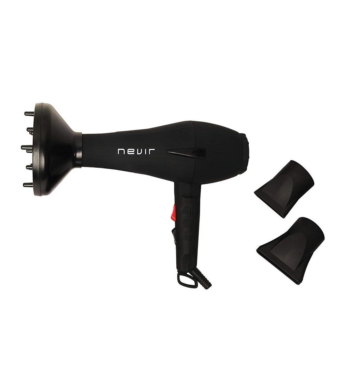 Découvrez le sèche-cheveux Nevir NVR2204S Ion Pro en noir mat, un petit appareil qui allie style et fonctionnalité. Son design épuré et moderne s'intègre à tous les environnements, ce qui en fait un complément idéal à votre routine beauté.