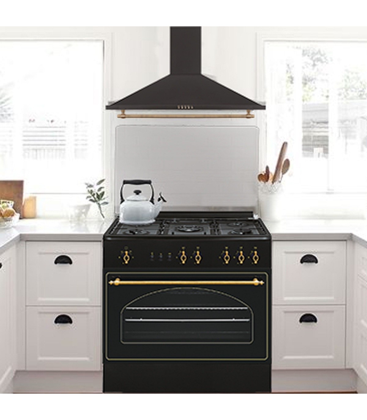 Diseño: Con un acabado negro rústico y detalles dorados, esta campana extractora agrega un toque de estilo y sofisticación a tu cocina.