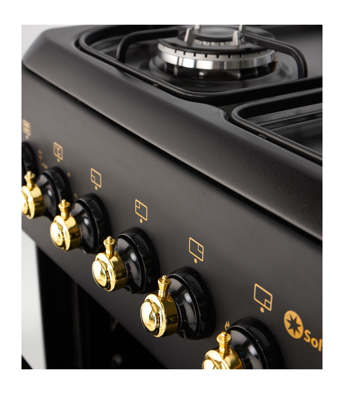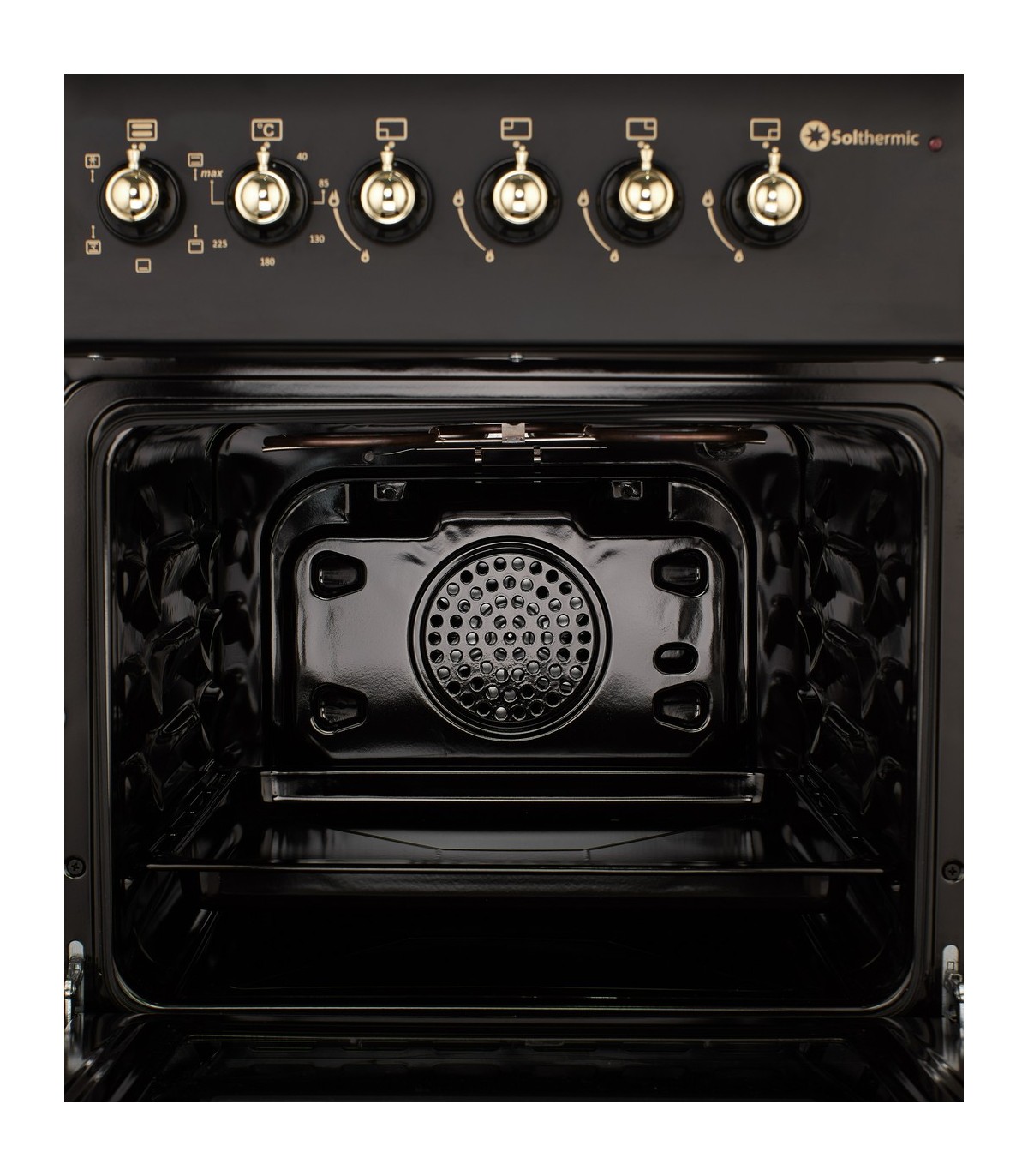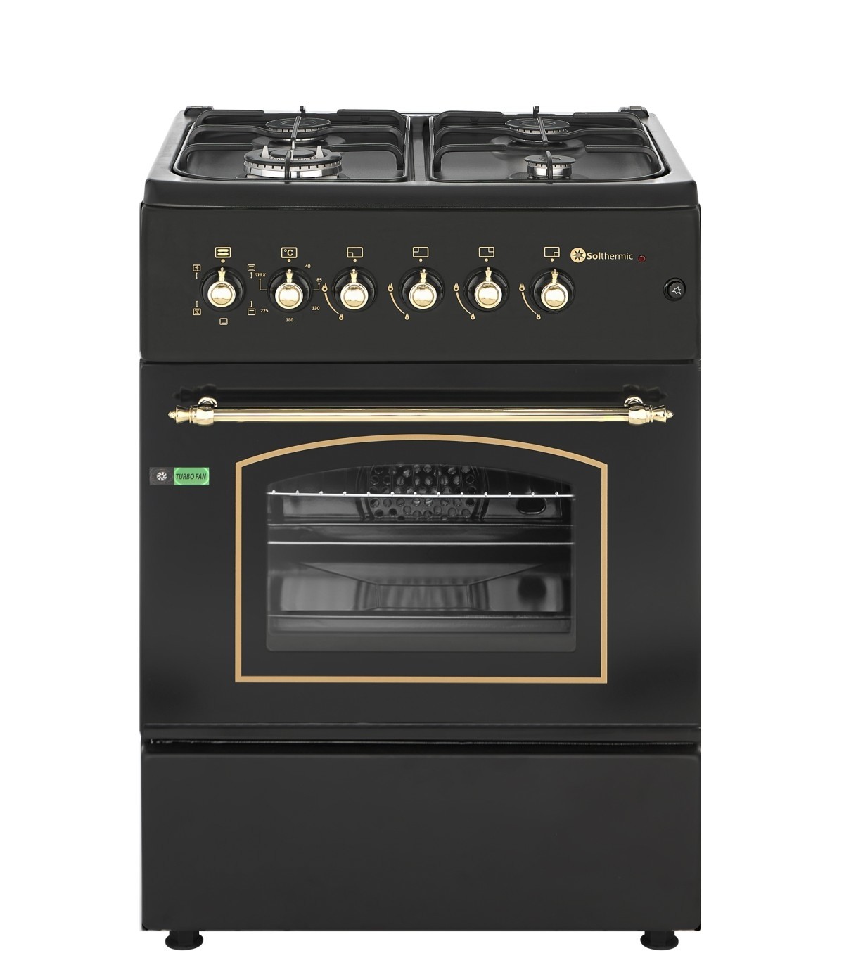 Sumérgete en la fusión de estética y funcionalidad con la Cocina Solthermic de Gas con Horno Eléctrico Turbo y Grill. Esta cocina combina la tradición de la cocina a gas con la innovación de un horno eléctrico turbo, todo ello envuelto en un impresionante diseño en negro rústico con detalles dorados.