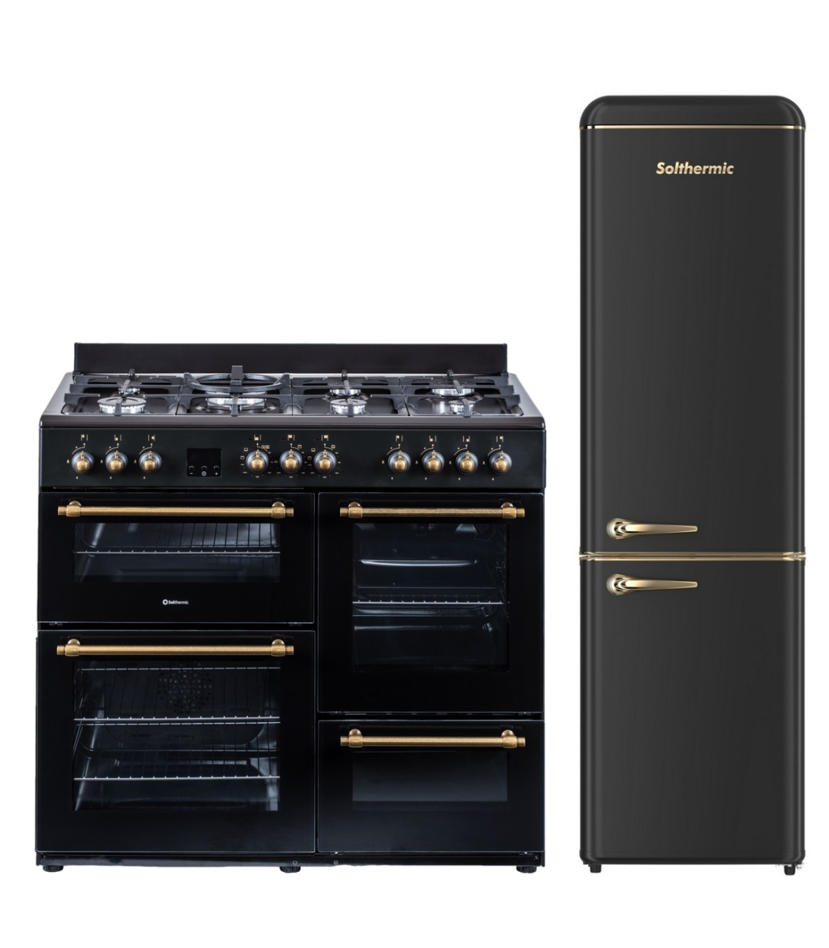 SOLTHERMIC® COMBO PACK CUISINIÈRE CUISINIÈRE NOIRE RUSTIQUE 7 BRÛLEURS AVEC 3 FOURS ÉLECTRIQUES + FRIGO-COMBI RETRO 1,88