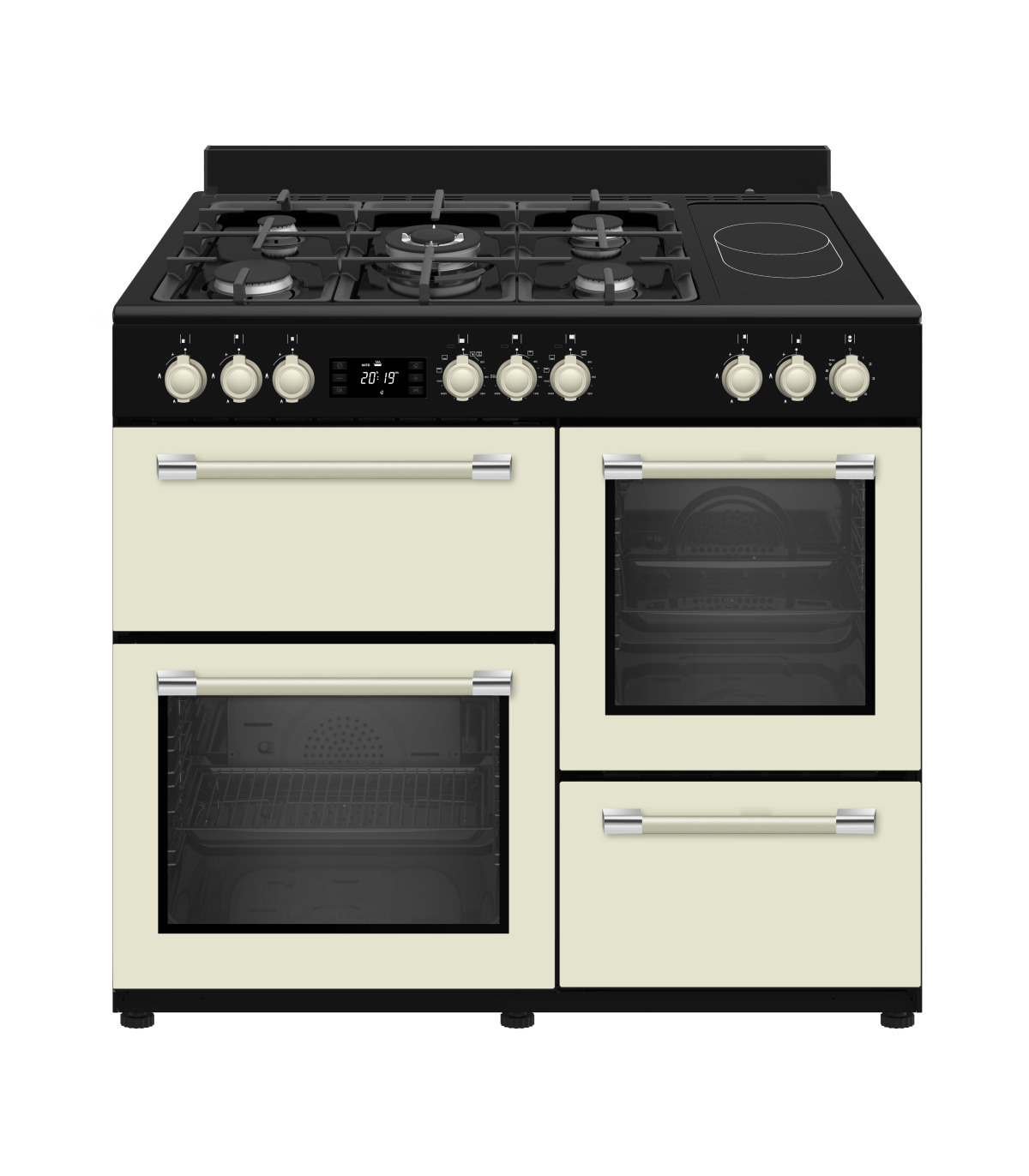 Cuisinière mixte (gaz et électricité) : Cette cuisinière combine le meilleur des deux mondes avec 5 plaques de cuisson à gaz et 2 zones de cuisson en vitrocéramique. De plus, elle dispose de 3 fours électriques pour une variété de méthodes de cuisson.