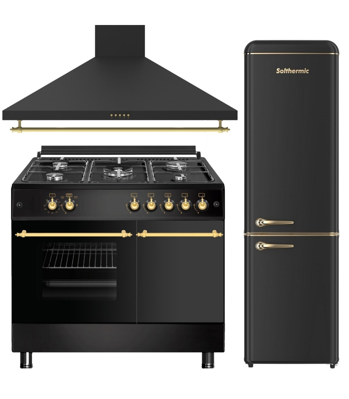 Te presentamos el conjunto de electrodomésticos Solthermic en elegante acabado negro rústico, diseñado para aportar modernidad y eficiencia a tu cocina. Este conjunto incluye: