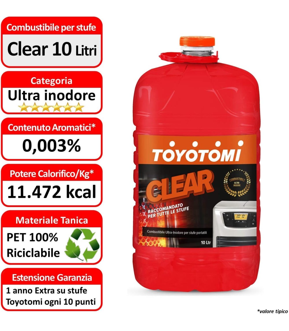 En résumé, "Toyotomi Clear" semble être un combustible liquide conçu dans un souci d'efficacité et de sécurité, en particulier pour une utilisation dans des cuisinières portables, et une attention est portée à l'impact environnemental grâce à l'utilisation d'un emballage recyclable.