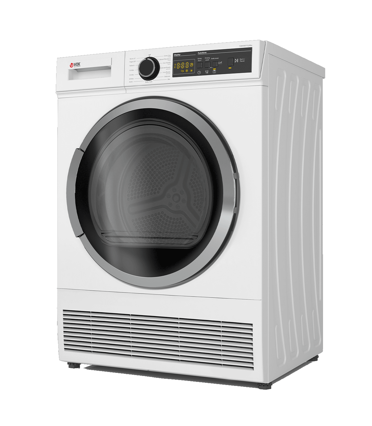 Démarrage différé, niveau de séchage, anti-froissage, démarrage / pause : touches de fonction pour personnaliser le cycle de séchage.
