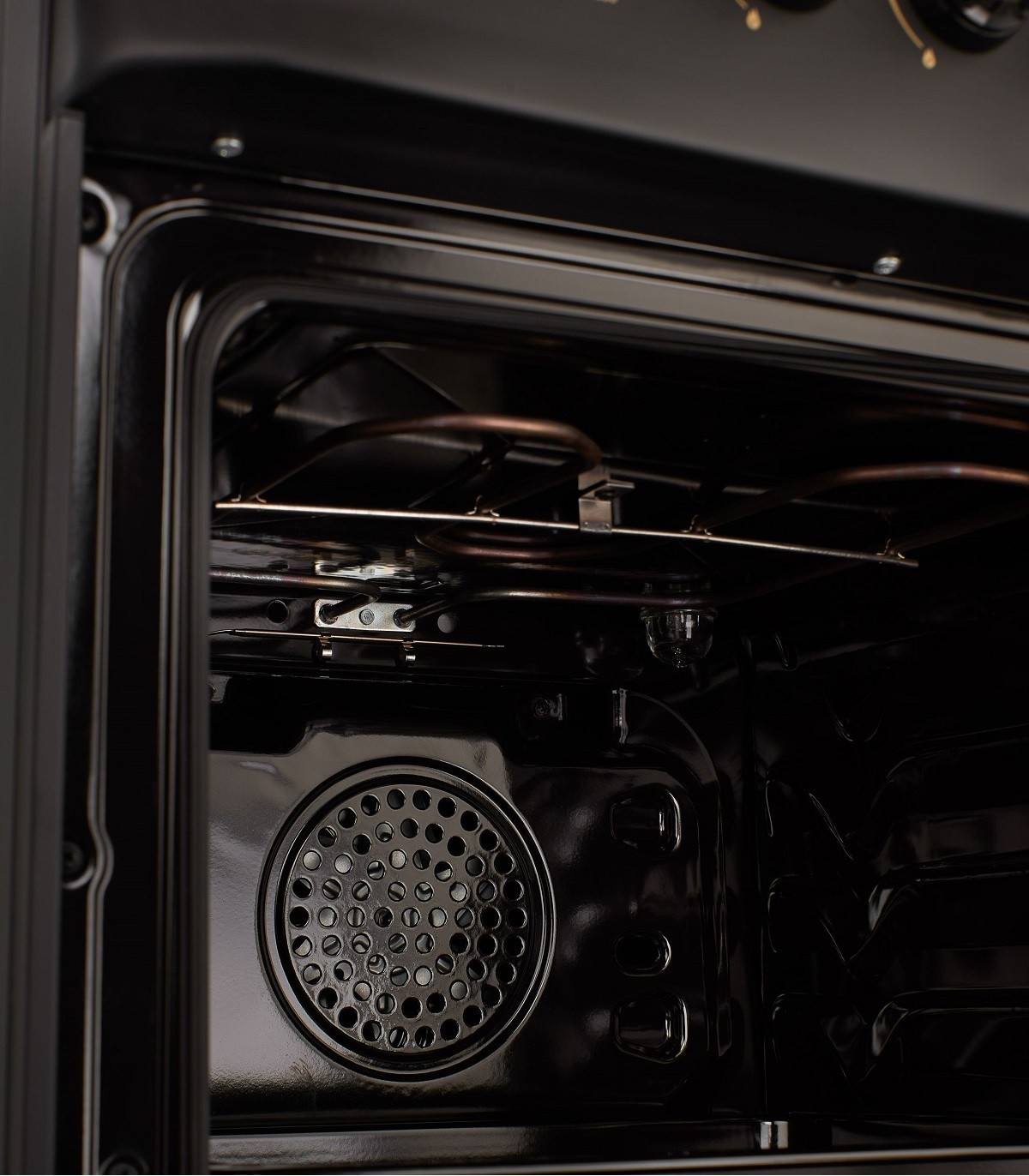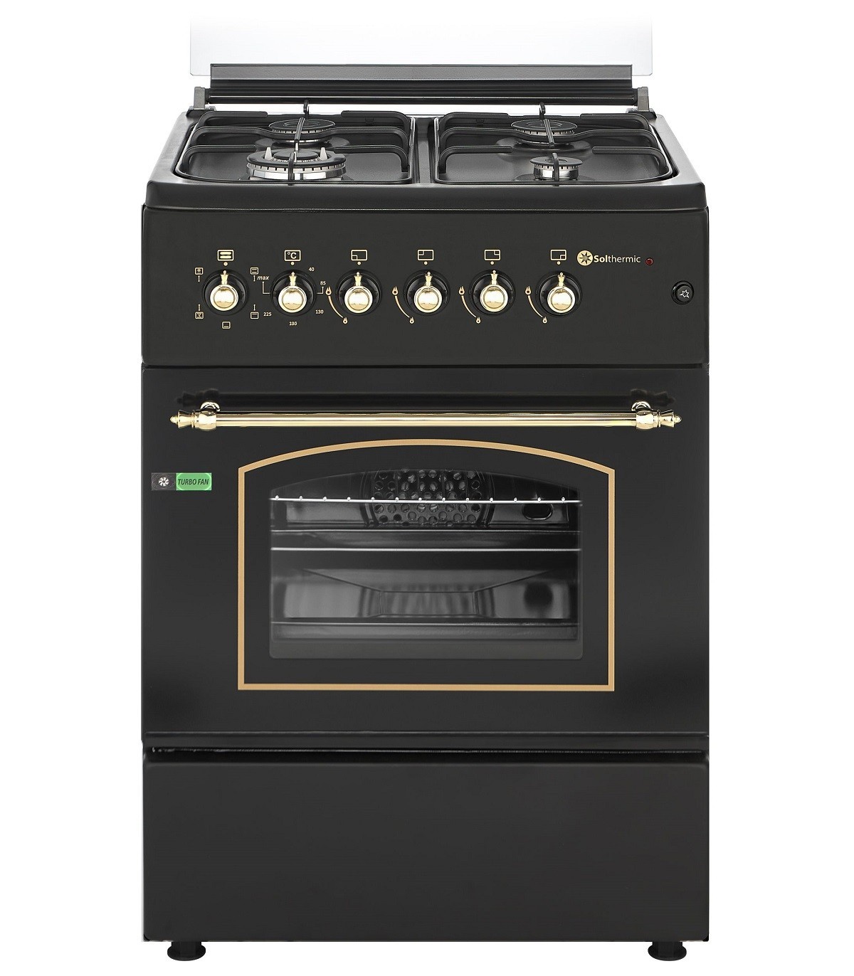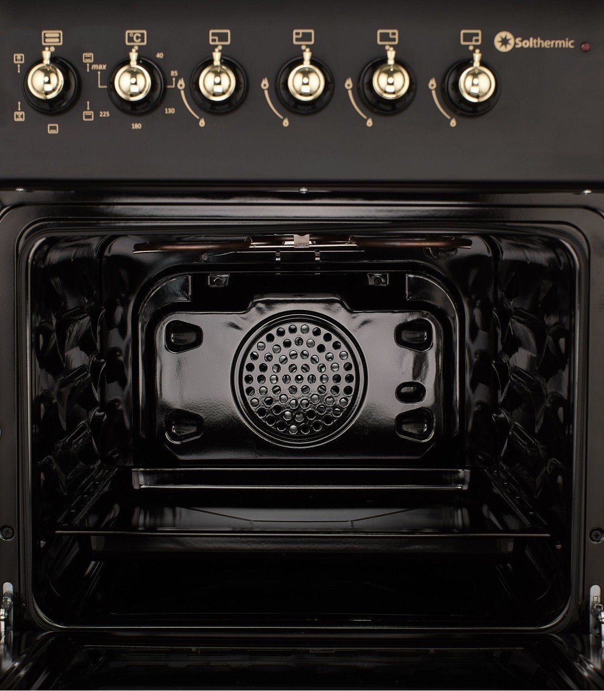Mergulhe na fusão da estética e da funcionalidade com o Fogão a Gás Solthermic com Forno Turbo Elétrico e Grill. Este fogão combina a tradição da cozedura a gás com a inovação de um forno turbo elétrico, tudo envolto num deslumbrante design rústico preto com detalhes dourados.