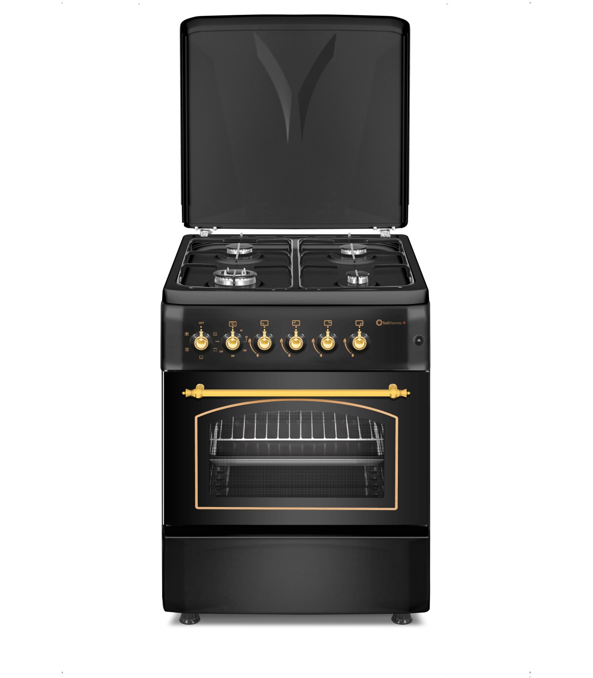 Mergulhe na fusão da estética e da funcionalidade com o Fogão a Gás Solthermic com Forno Turbo Elétrico e Grill. Este fogão combina a tradição da cozedura a gás com a inovação de um forno turbo elétrico, tudo envolto num deslumbrante design rústico preto com detalhes dourados.