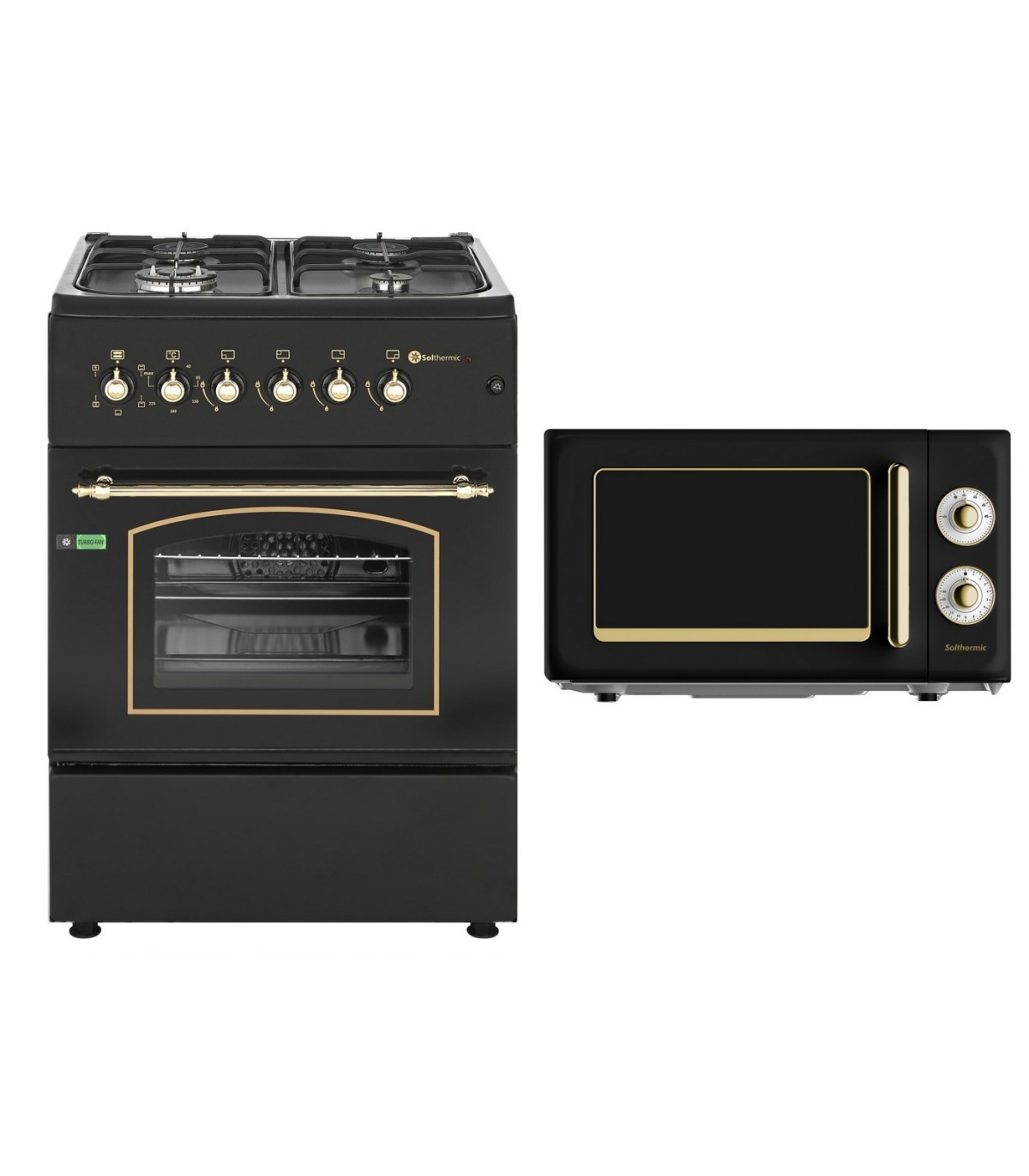 SOLTHERMIC® COMBO PACK F6S40E5RB FOGÃO A GÁS PRETO RÚSTICO 60X60 COM FORNO ELÉCTRICO + FORNO MICROONDAS PRETO RÚSTICO
