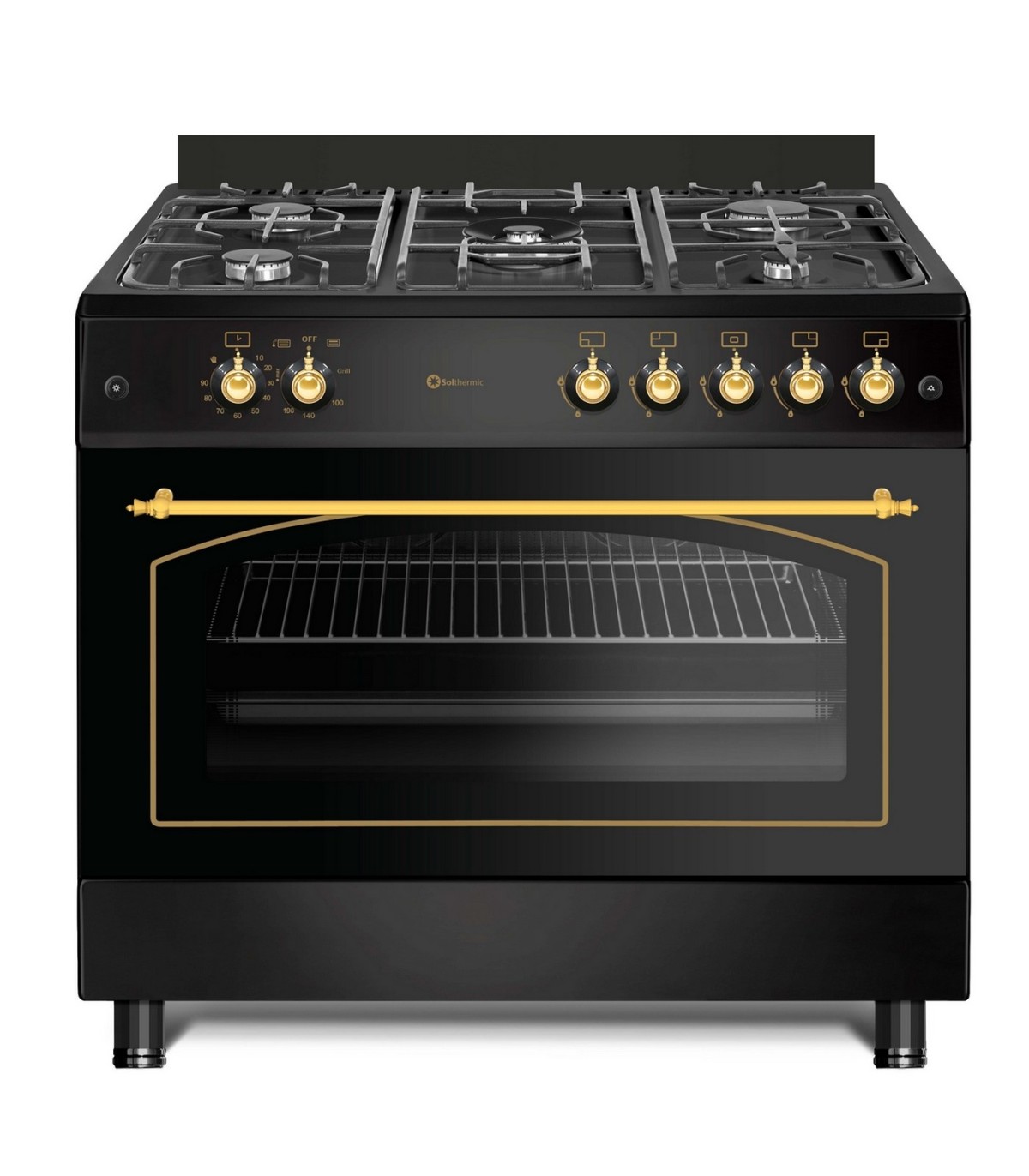 Entre na excelência culinária com o fogão Solthermic numa deslumbrante cor preta rústica, adornada com puxadores e acabamentos dourados. Esta gama é muito mais do que um eletrodoméstico; é uma obra-prima culinária que acrescenta um toque de luxo à sua casa.