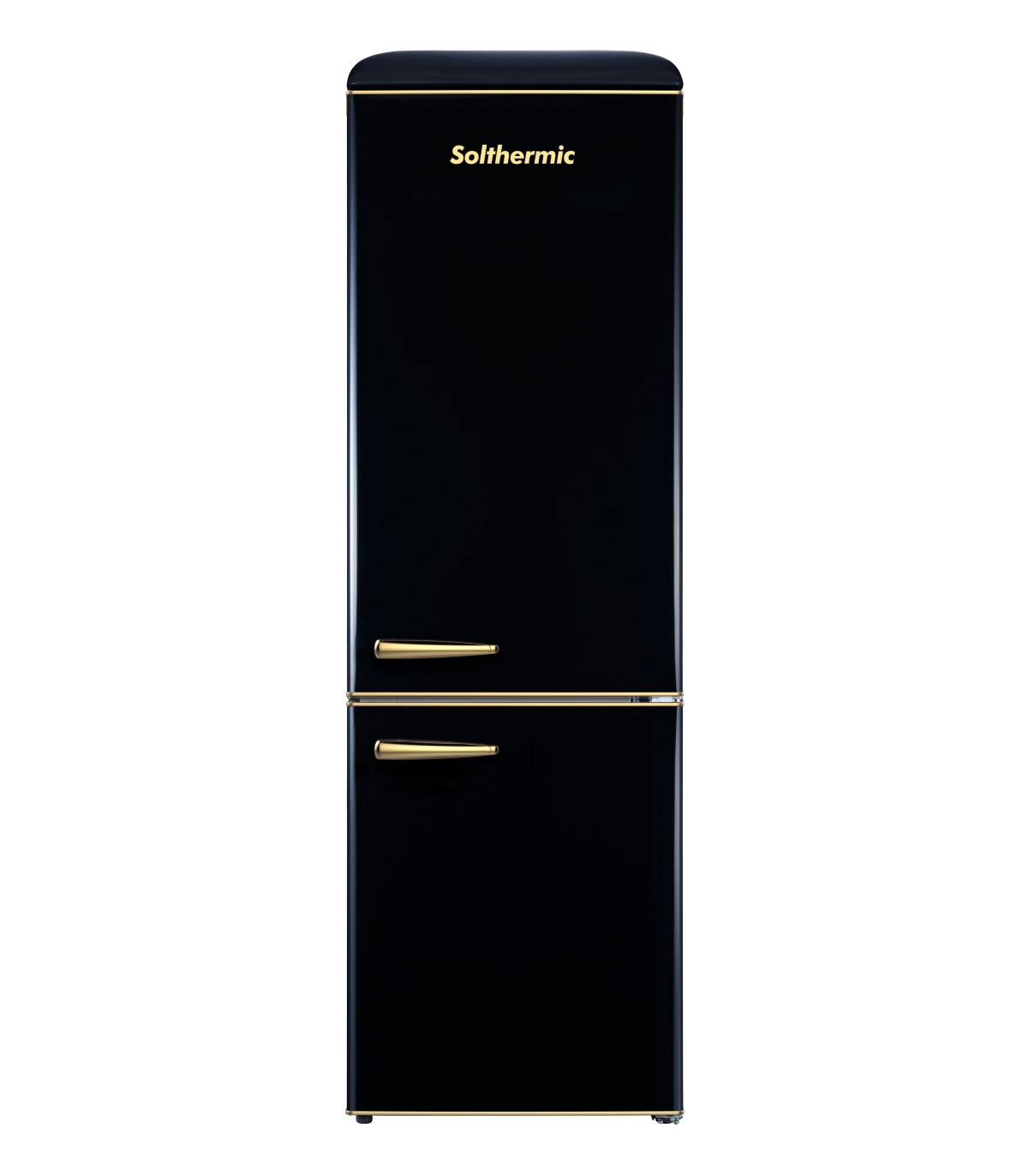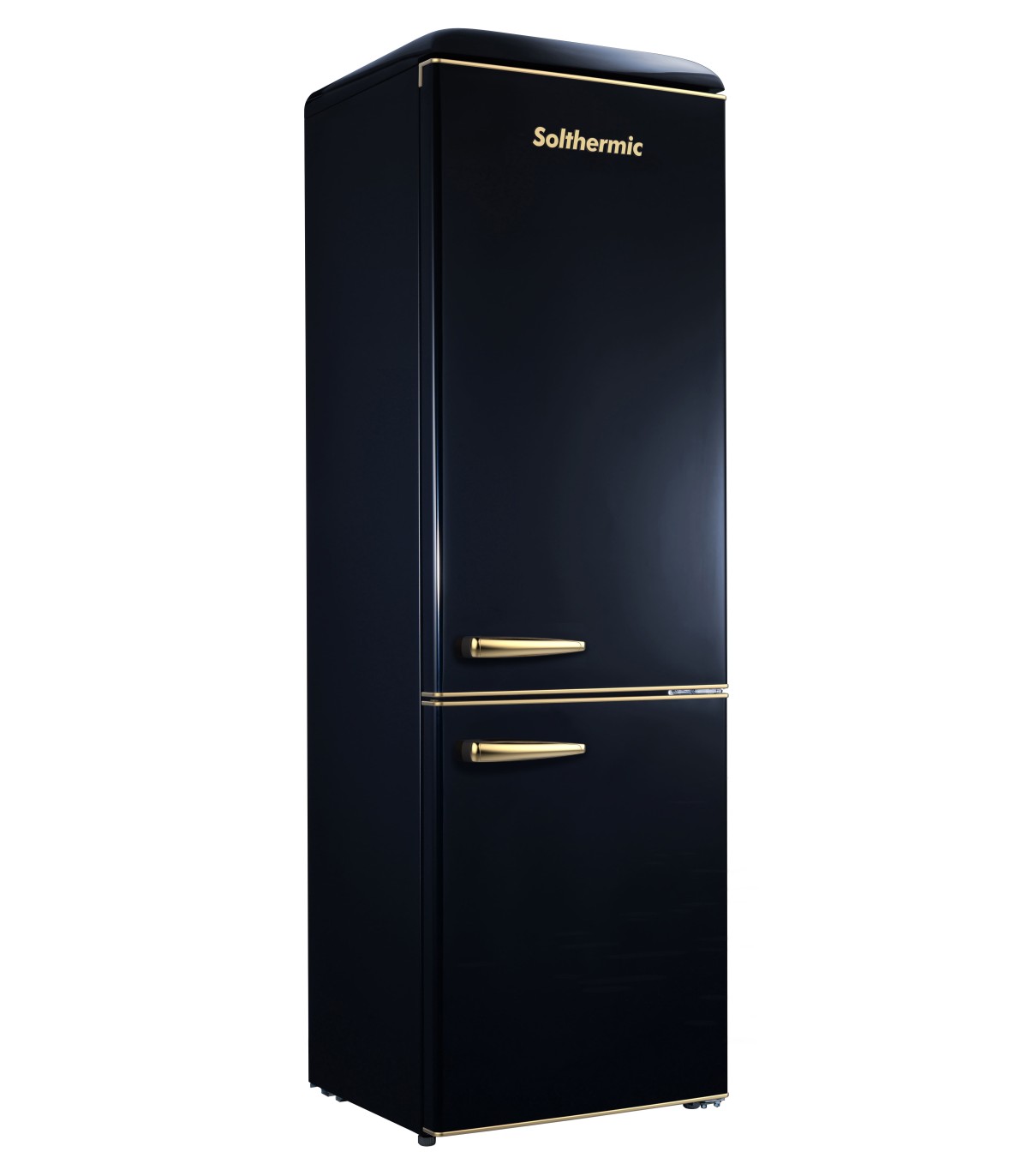 O Solthermic Frigo-Combi Retro 1.92 FCR192NG destaca-se pelo seu estilo vintage em preto rústico com acabamentos dourados, combinando design e funcionalidade. Com dimensões de 1.920 x 599 x 628 mm, é ideal para casas, escritórios ou apartamentos com espaço limitado, oferecendo uma grande capacidade sem ocupar muito espaço.